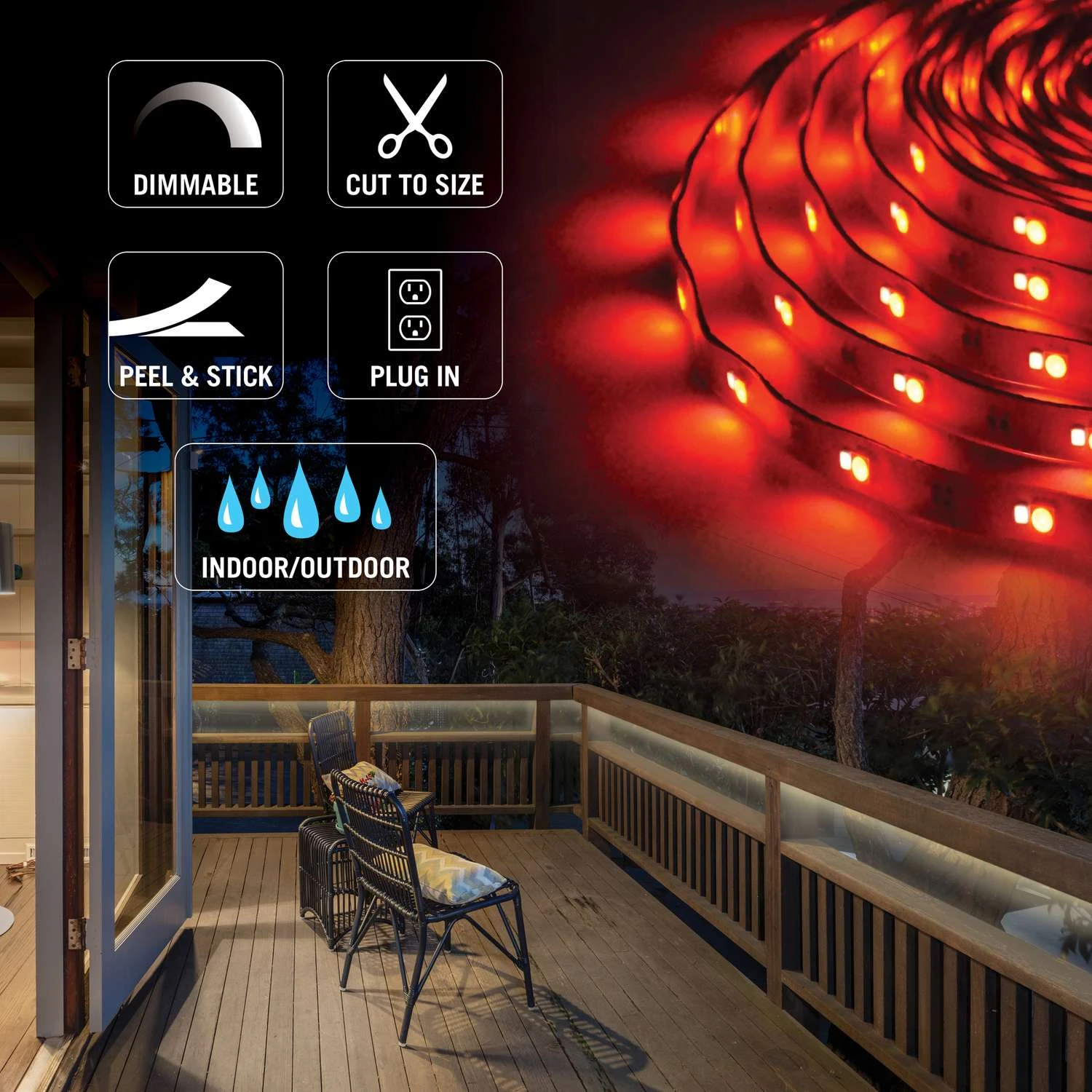 The Armacost Lighting RibbonFlex Home Multicolor RGB+ White LED strip light kit is the perfect solution for versatile indoor or outdoor accent lighting including under cabinets, shelving, decks and patios. Full-range brightness and color control with included wireless remote; RF technology works through walls up to 50 ft. away. Adhesive backing for easy installation. For indoor and outdoor use.No assembly required, ready to go out of the boxFully dimmable with included remoteRF remote control works through walls25 preset colors and plus whiteEasy peel-and-stick installation and use as-is or cut to size40 preset effects (fade, strobe, dissolve and jump) with fully adjustable speedIndependent control of white and color-changing LEDs for richer color or a clean white light