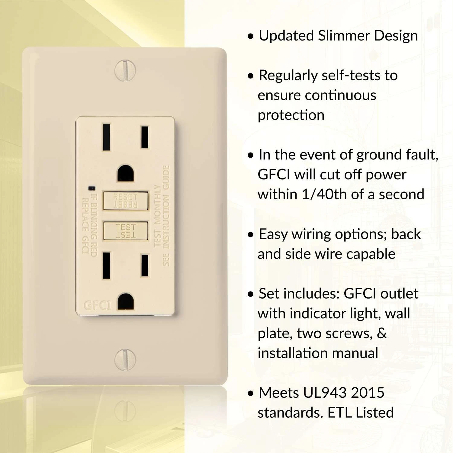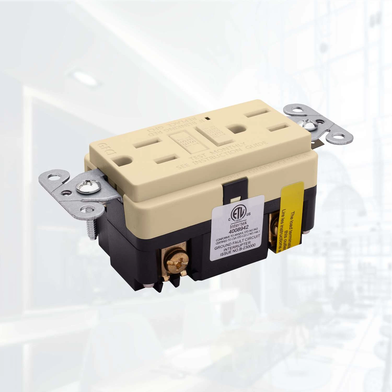 The Faith Electric GLS-15A-IV-10 self-testing ground fault circuit interrupter outlet provides continuous protection from ground faults, disconnecting power in 1/40 of a second if a dangerous condition is detected. Once connected to power, this GFCI receptacle automatically self-tests every 2-1/2 hours. The green indicator LED light turns off if the outlet is not receiving power, is broken or if it is at end-of-life. Slimmer, modern design for easier and quicker installation in electrical boxes. Test and reset buttons match the device face color to blend in seamlessly.Meets or exceeds UL943 2015 standards, compliant with National Electric Code (NEC) requirementsNew slim, modern design for easier and quicker installation in shallow electrical boxesProvides protection from electrical shocks that might occur from faulty appliances in damp locationsTo ensure continuous protection against ground faults, the GFCI outlet conducts automatic self-testsDevice detects and trips on ground faults within 1/40 of a secondTerminals allow for easy wiring options, back and side wire capableGreen LED indicator light shows that the device is functioning correctlyInstall in your bathroom, kitchen, garage and basementTamper-resistant shutter safety mechanism blocks access to power unless a plug is inserted, providing an extra layer of safety in households with children