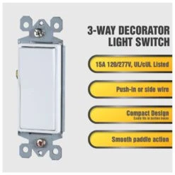 The Faith SSK1B-WH decorative light switch is a 15 Amp 120-277V AC 3 way switch designed to transform your old switches for a more modern, sleek look. Constructed with superior – material, this toggle switch is designed for either residential or commercial. Easy to clean by its smooth finish and soft edges. control your ceiling light from two different locations in your room with this . Easy to install and push-in and side wiring for secure mounting.3-way light switch, glossy white, UL/cUL listedEach outlet receptacle is made of high-quality, rugged thermoplastic polycarbonate material to ensure a long service lifeThe Faith rocker light switch is engineered with a shallow design to easily fit in standard junction boxes and supports push-in and side wiring installationModern decorative light switches are perfect for residential use such as in houses, apartments, condos as well as most commercial areas requiring 15 Amp switchesEach glossy white light switch is easy to clean and has a smooth, satisfactory paddle actionEach light switch is individually bagged to protect against dust while in storage