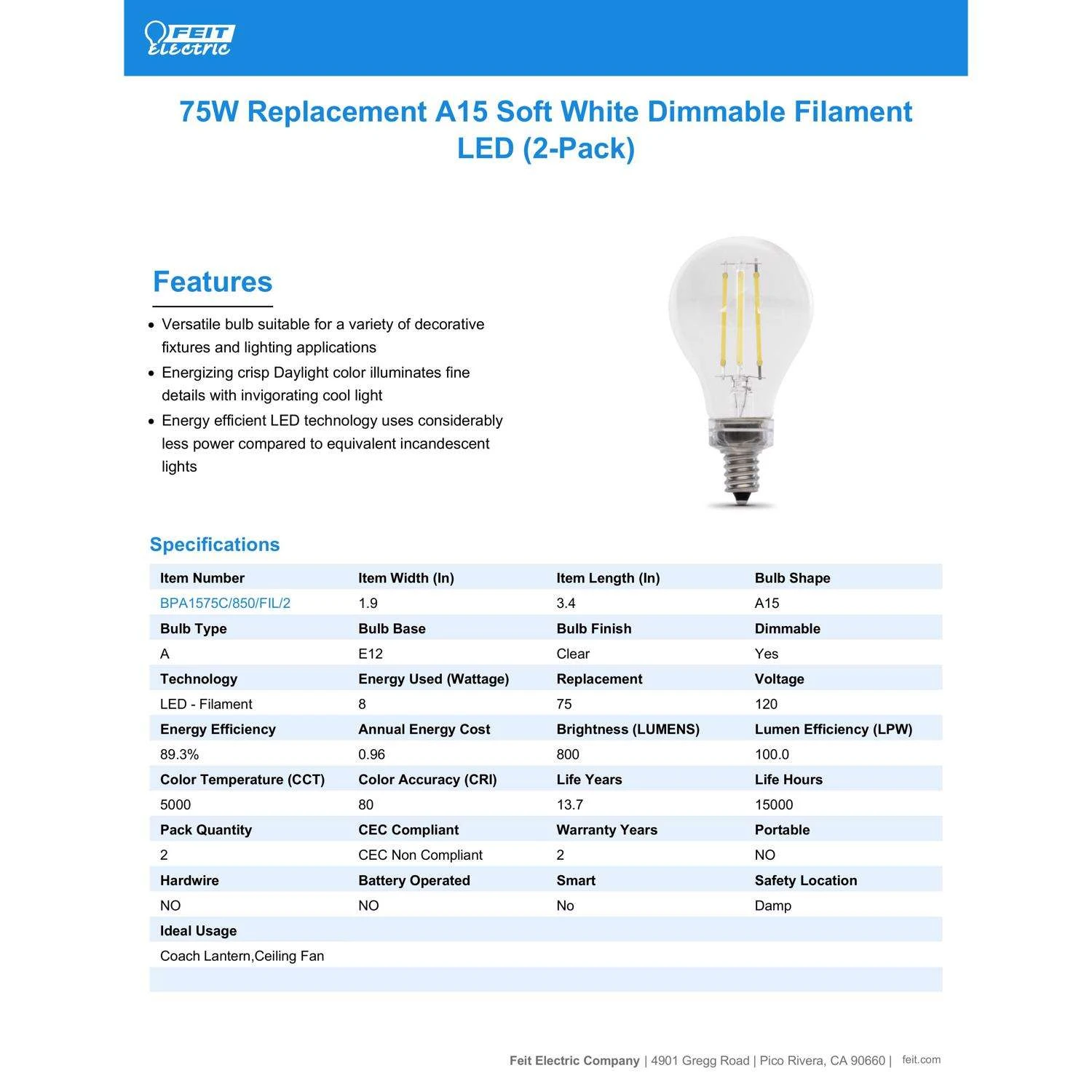 | Search Field | Feit LED A15 E12 (Candelabra) Filament LED Bulb Daylight 75 Watt Equivalence 2 pk Light Bulbs LED Bulbs LED LIGHT BULBS A-LINE BULB – LED FEIT ELECTRIC CO Feit LED 75__rexuom__watts 75__rexuom__watt 2__rexuom__pk 2__rexuom__pack |