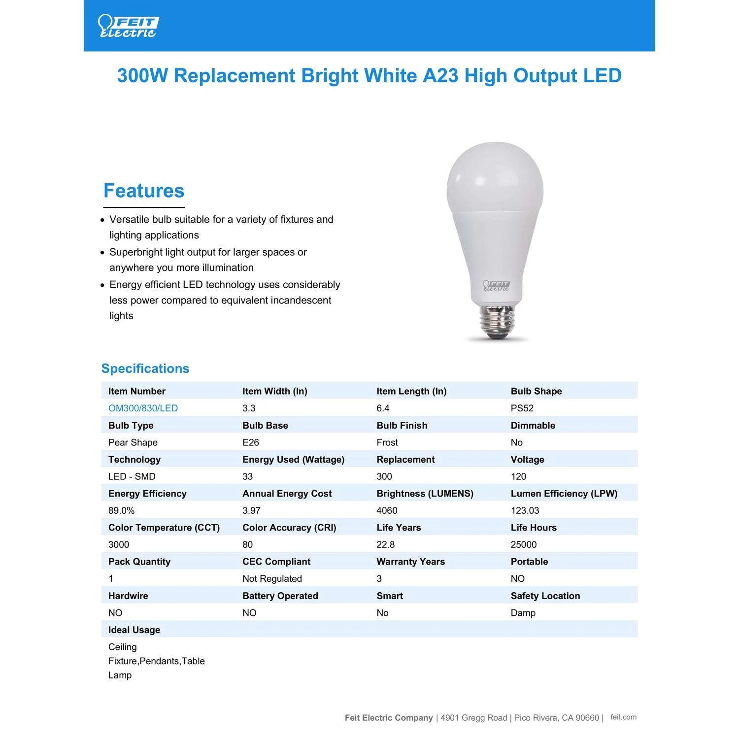 | Search Field | Feit LED A23 E26 (Medium) LED Bulb Bright White 300 Watt Equivalence 1 pk Light Bulbs LED Bulbs LED LIGHT BULBS A-LINE BULB – LED FEIT ELECTRIC CO Feit LED 300__rexuom__watts 300__rexuom__watt 1__rexuom__pk 1__rexuom__pack |