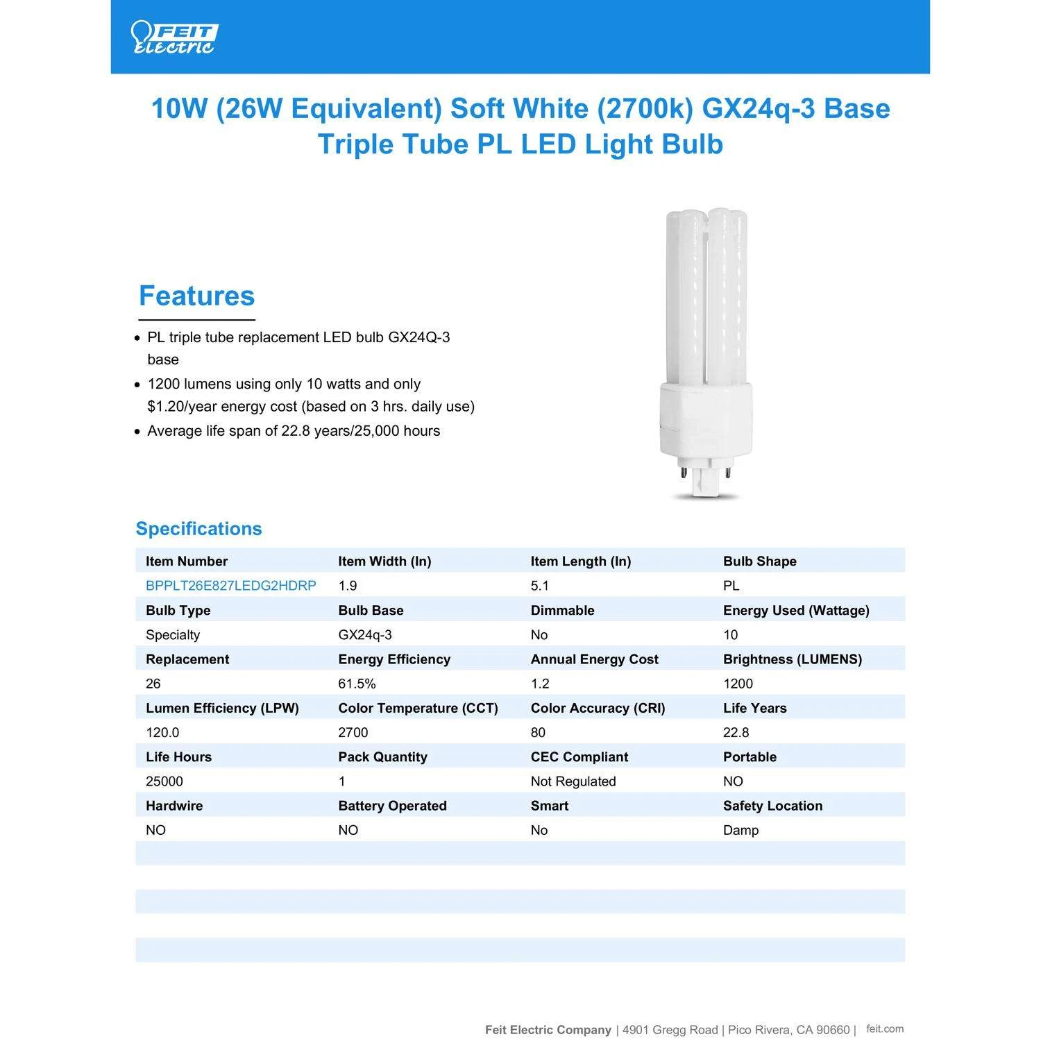 | Search Field | Feit LED Linear PL GX24Q-3 4-Pin LED Light Bulb Soft White 26 Watt Equivalence 1 pk Light Bulbs LED Bulbs LED LIGHT BULBS SPECIALTY LED FEIT ELECTRIC CO Feit LED Linear 26__rexuom__watts 26__rexuom__watt 1__rexuom__pk 1__rexuom__pack |