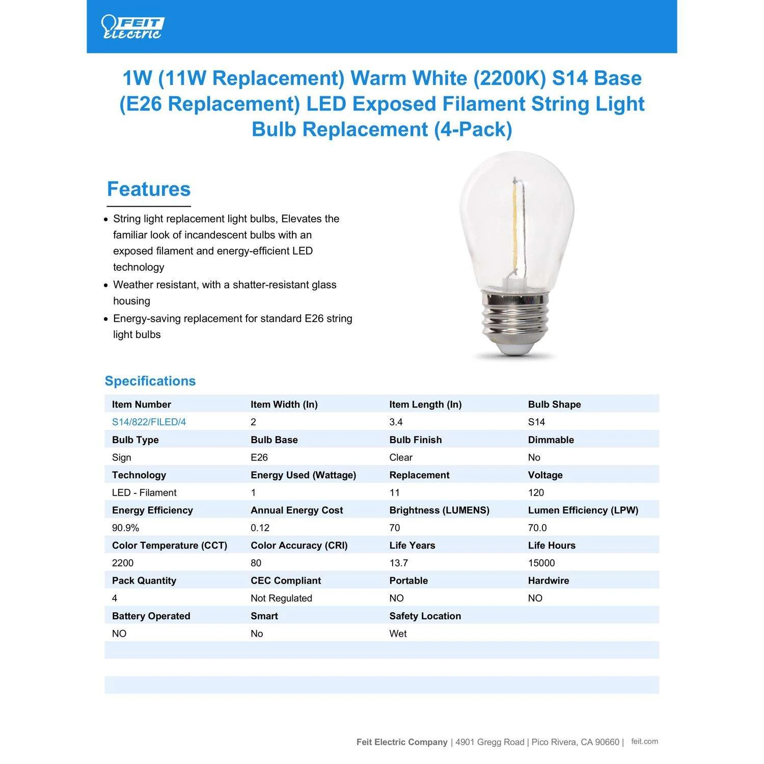 | Search Field | Feit LED S14 E26 (Medium) LED Bulb Warm White 11 Watt Equivalence 4 pk Light Bulbs LED Bulbs SUMMER LIGHTING DECOR PATIO LIGHTING ACCESSORIE FEIT ELECTRIC CO Feit LED 11__rexuom__watts 11__rexuom__watt 4__rexuom__pk 4__rexuom__pack |
