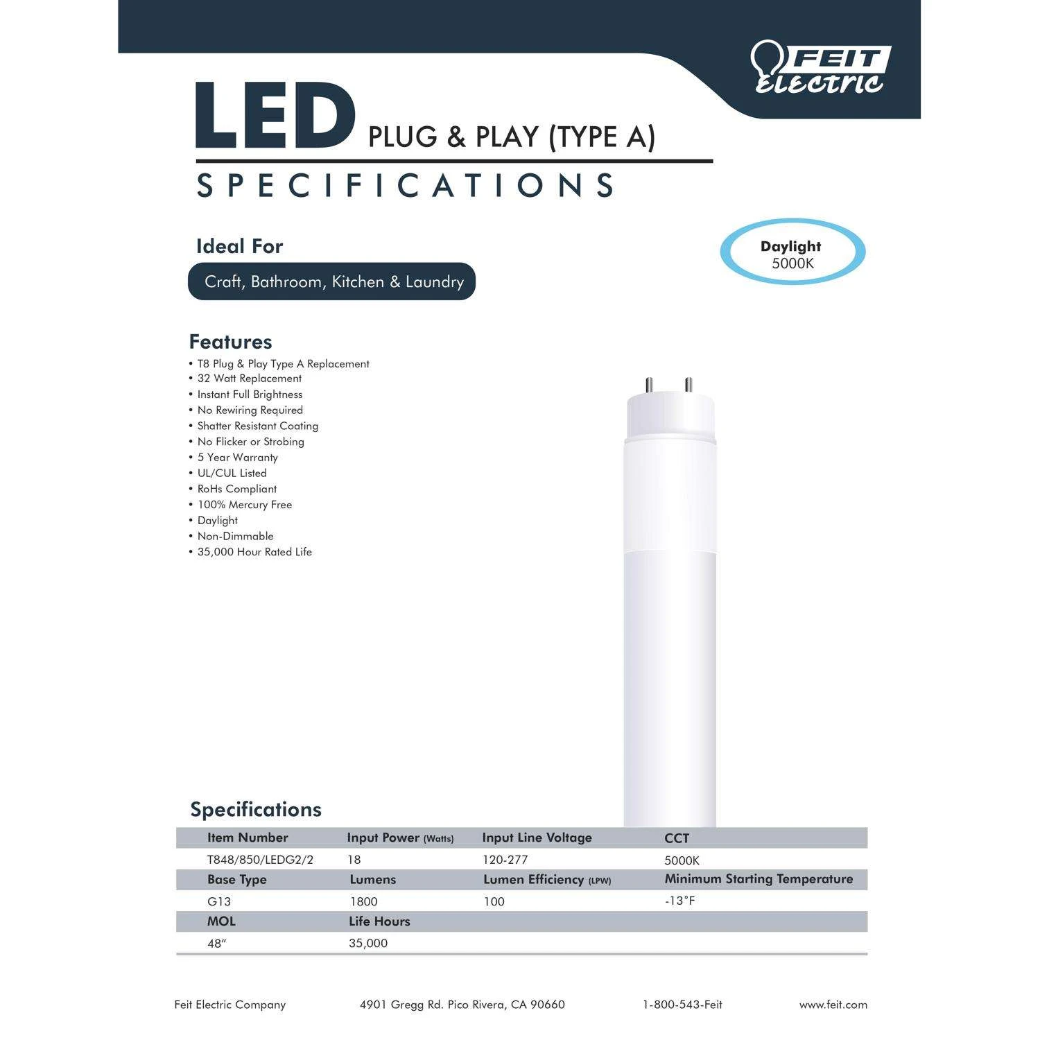 Feit Plug & Play T8 Daylight 47.7 In. Bi-Pin Linear LED Bulb 32 Watt Equivalence 2 Pk