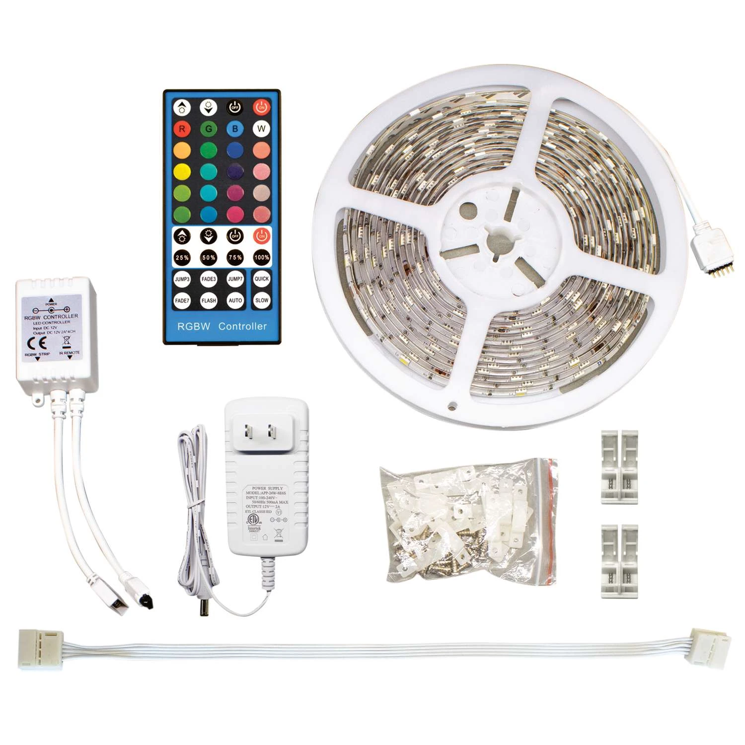 | What's Included | 16ft of tape light, power transformer, remote control, IR receiver, mounting clips |