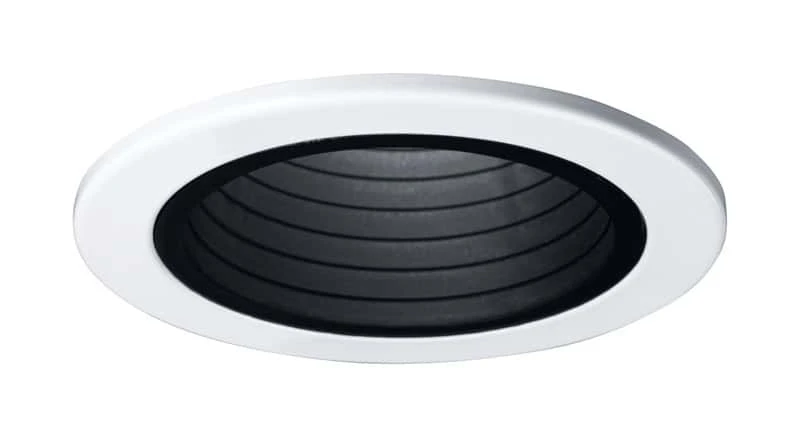 Step Baffle 4 inch Black and White plastic step baffle with white metal trim ring. Comes with friction clips to secure to housing. This E26 series 4 inch baffle trims trap and shape light to minimize aperture glare and reduce ceiling brightness.Suitable for new construction and remodelingMaximum bulb 50 wattMade of plastic