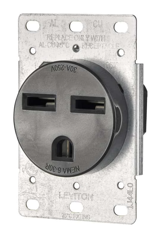 Built of durable thermoplastic, Leviton Power Receptacles come equipped with heavy-gauge, double-wire copper alloy contacts. To ensure correct and speedy wiring, terminals have ID markings. Flush mount receptacles fit Leviton’s wide range of 2.15-inch diameter wallplates and mounting hardware is included.Flush mountSide wiredSteel strap material