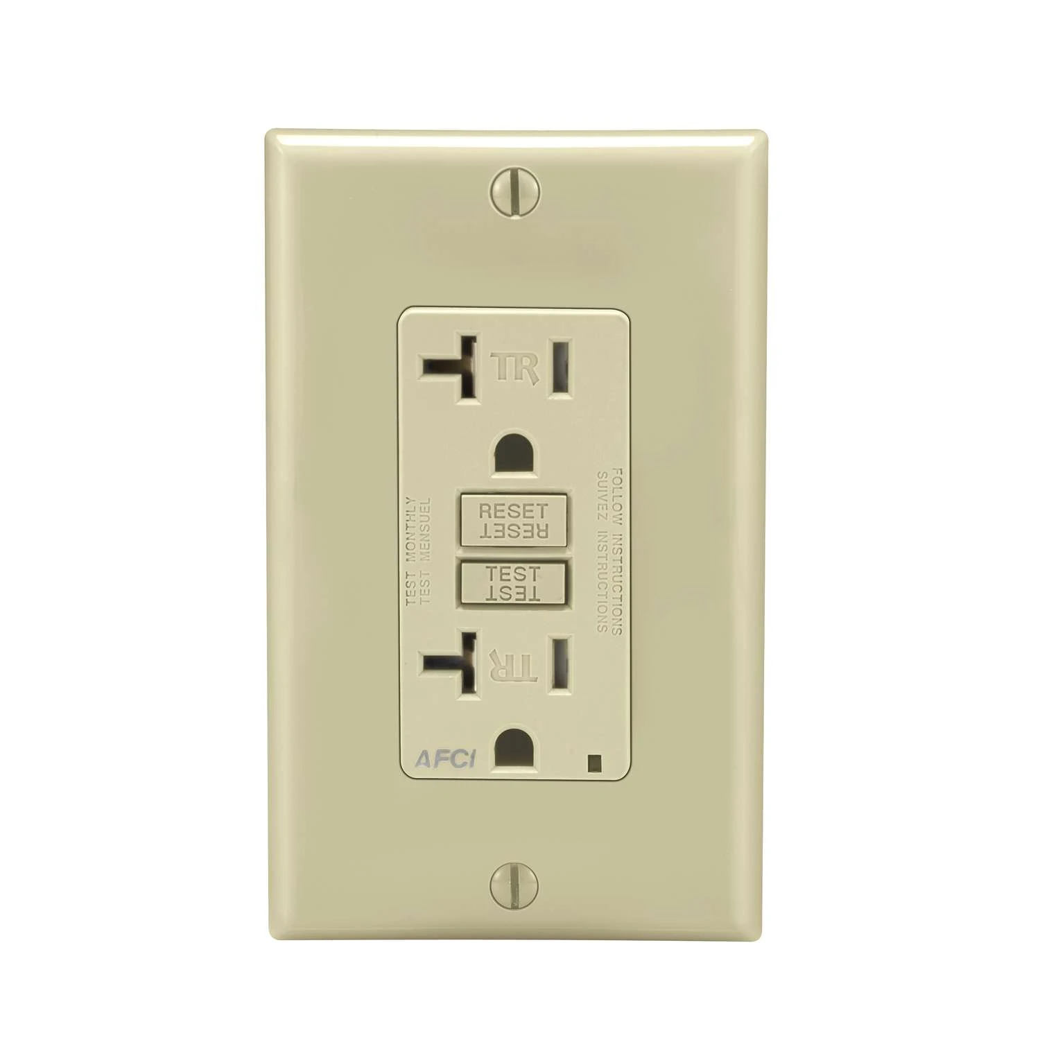 20 Amp Tamper Resistant AFCI Duplex Outlet, Ivory20A-125VAFCIs should be installed in all living areas such as living roomsIdentifies potentially dangerous arc-faults and responds by interrupting powerArc Fault Circuit Interrupter (AFCI) Outlets detect hazardous arc-faults and interrupt power to protect your home and family from the risk of electrical firesTamper-resistant – shutter mechanism inside the receptacle helps prevent access to the contacts unless a two-prong plug is inserted