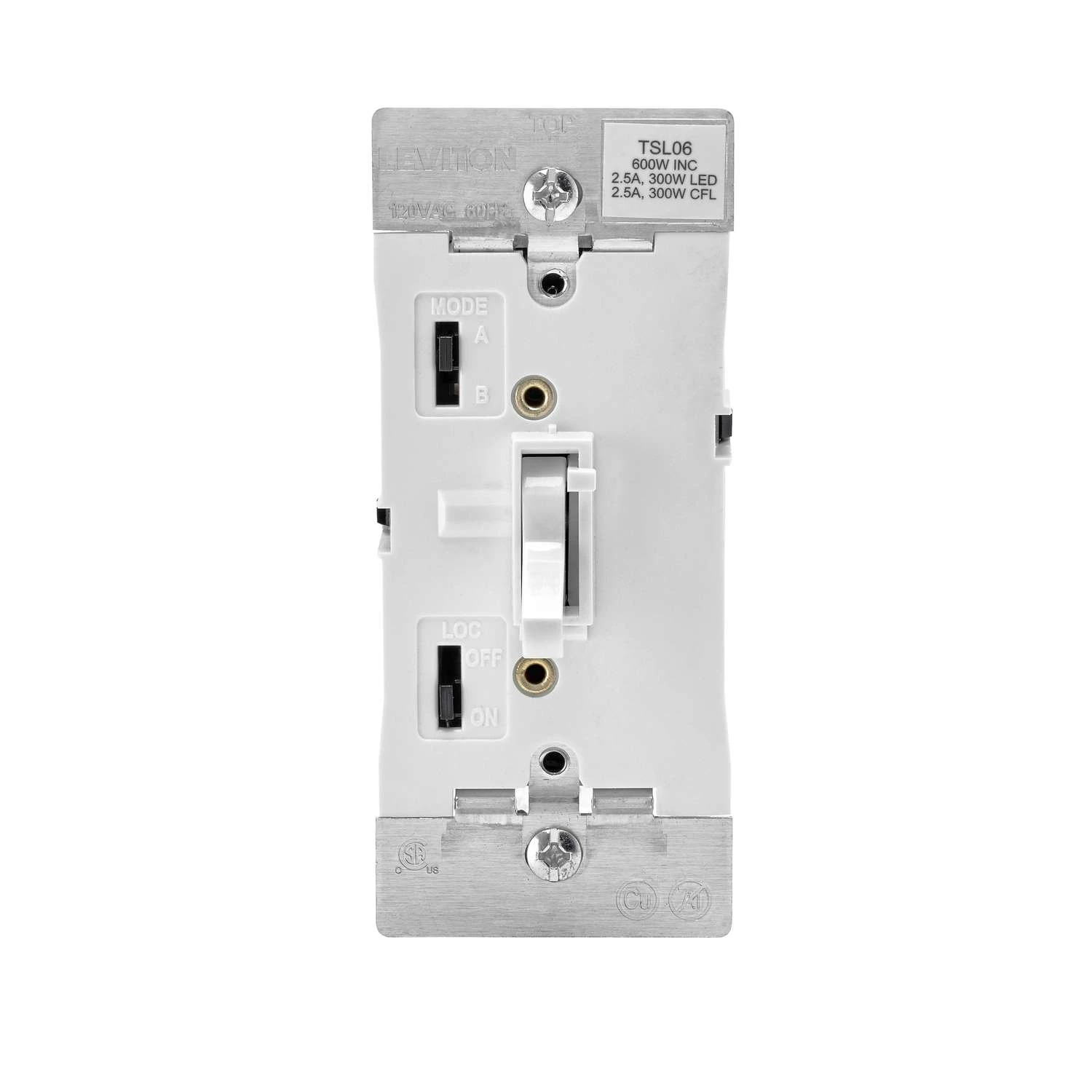 Leviton Toggle Slide Universal Dimmers provide smooth, slide-action, full-range dimming for incandescent, dimmable LEDs and dimmable CFL loads. They combine a toggle switch with a full-range slide bar for precise lighting control. For a traditional home, the classic style of Toggle Slide Controls offers the ideal way to upgrade the functionality of devices without compromising the character of the decor.Built-in radio/TV interference filterUniversal toggle dimmer works with any dimmable LED, CFL, incandescent or halogen bulbIntegrated linear full-range slide control for easy, precise operationWider dimming range for LED and CFL lamps than conventional incandescent dimmersToggle switch with built in locator light can be disabledWider dimming range for LED and CFL lamps than conventional incandescent dimmersProgramming feature allows users to modify the dimming range to optimize low light level performance when requiredToggle switch with built-in locator light can be disabledIntegrated linear full-range slide control for easy, precise operationSlim, compact housing fits easily into a standard wallbox