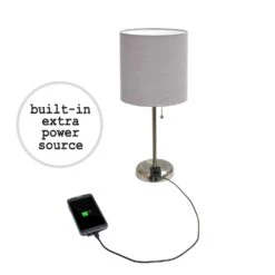 This fun and fashionable lamp feature a brushed steel base and a fabric shade. It comes equipped with a 2 prong outlet seated in the base for use to charge mobile phones, handheld games, tablets and other small electronics. This lamp will add a fabulous flair to any room. Perfect for bedrooms, kids and teens, college dorms, nurseries or fun offices.USB port on base for charging your phone or other devicesIdeal for desktop use to illuminate your work spacePull chain makes it easy to switch on and off the light
