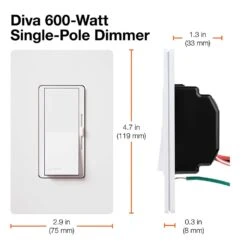 The Lutron Diva dimmer switch is a simple and elegant solution designed to match your existing designer opening switches and accessories. This Diva dimmer switch is for use in 600-Watt Single Pole applications. You can easily turn the lights on and off with the paddle style switch. While the lights are turned on, use the slide control to adjust the lights to your desired level creating your perfect light. The paddle switch returns the lights to your favorite preset level. A soft locator light glows in the off position, making the dimmer easy to find in the dark. Installing a Diva dimmer switch is easy and saves energy too. You can replace your existing switch with a Diva dimmer switch in as little as 15 minutes. Then dim the lights just 50% to save 40% electricity and extend bulb life 10 times. A matching Claro wall plate is included.Product only works with incandescent and halogen bulbs; to dim LED bulbs, use DVWCL-153PH-ALMatches many existing decorator-style switchesFeatures a large rocker paddle switch and small sliding dimmer switch for precise lighting controlDim the lights just 50% to save 40% electricity and extend bulb life 10 timesWall plate includedSoft locator light in off-position for easy finding in the darkFor use in 600-Watt single pole applicationsIncludes (1) Diva dimmer switch and (1) coordinating wallplate