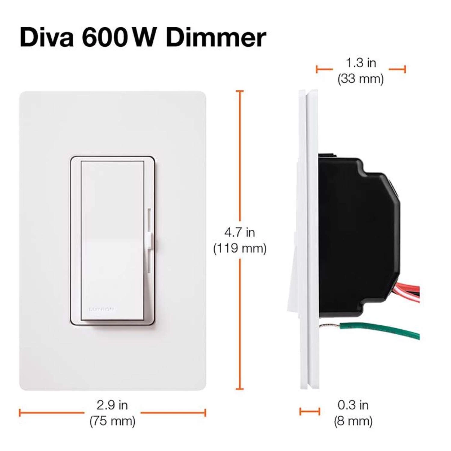 The Lutron Diva dimmer switch is a simple and elegant solution designed to match your existing designer opening switches and accessories. This Diva dimmer switch is for use in 600-Watt Single Pole or 3-Way applications. You can easily turn the lights on and off with the paddle style switch. While the lights are turned on, use the slide control to adjust the lights to your desired level creating your perfect light. The paddle switch returns the lights to your favorite preset level. A soft locator light glows in the off position, making the dimmer easy to find in the dark. Installing a Diva dimmer switch is easy and saves energy too. You can replace your existing switch with a Diva dimmer switch in as little as 15 minutes. Then dim the lights just 50% to save 40% electricity and extend bulb life 10 times. A matching Claro wall plate is included.Product only works with incandescent and halogen bulbs; to dim LED bulbs, use DVWCL-153PH-WHMatches existing decorator-style switchesFeatures a large rocker paddle switch and small sliding dimmer switch for precise lighting controlDim the lights just 50% to save 40% electricity and extend bulb life 10 timesSoft locator light in off-position for easy finding in the dark