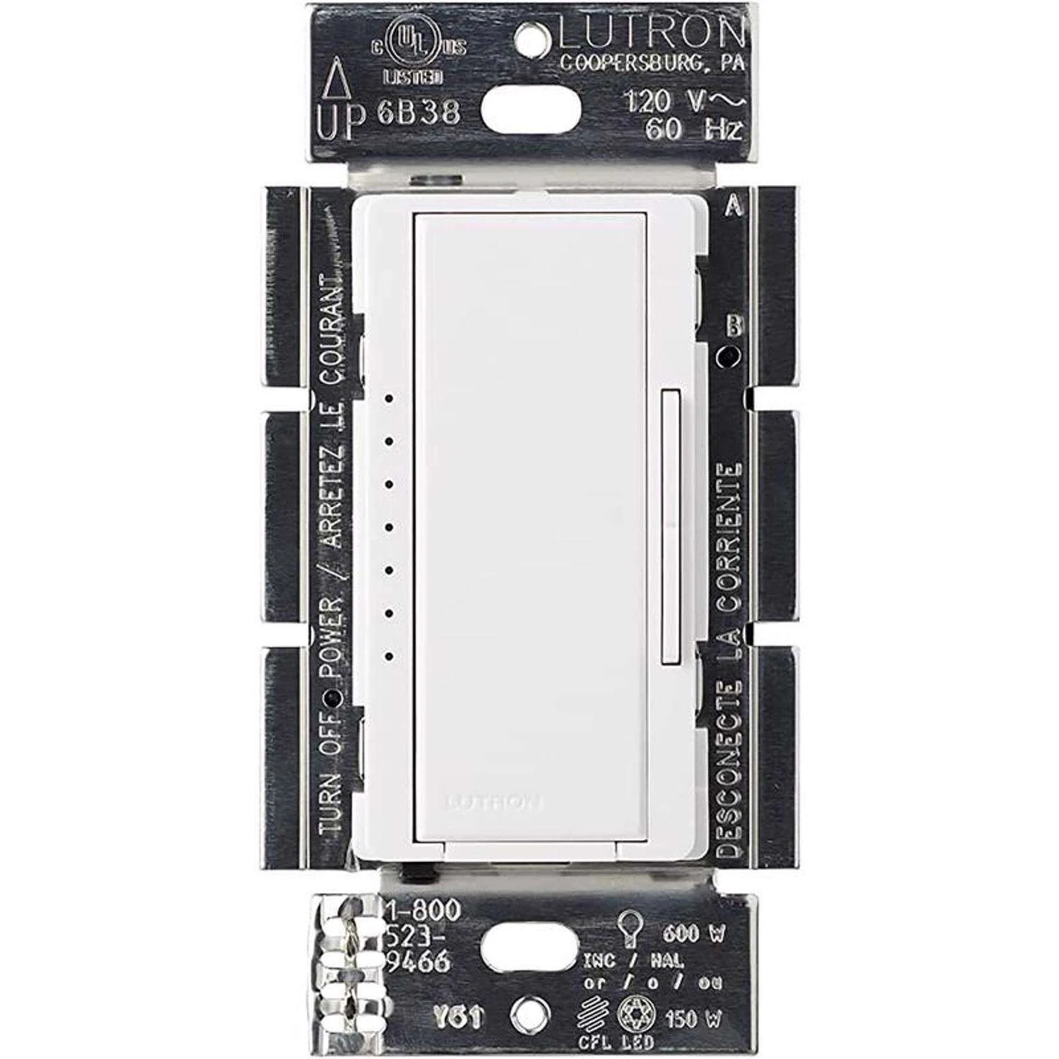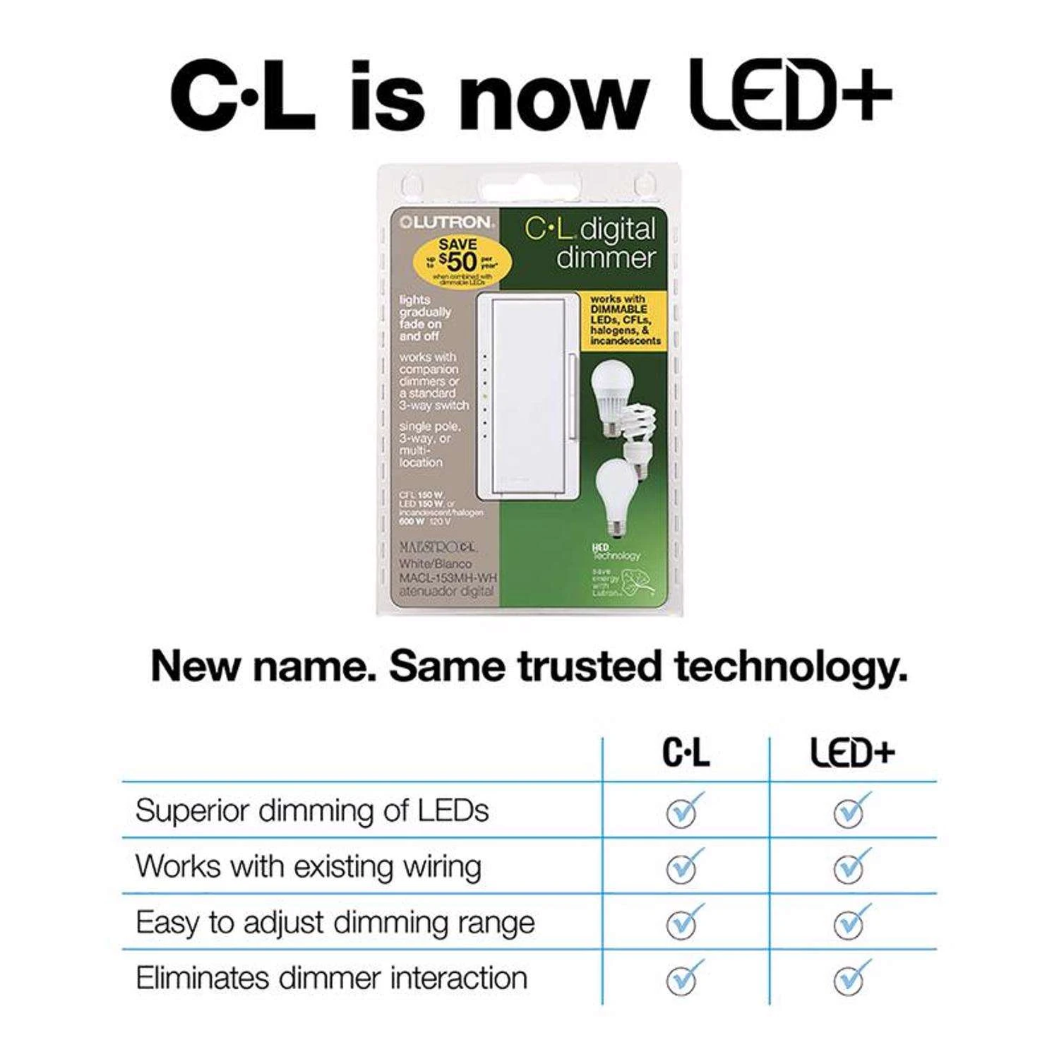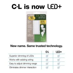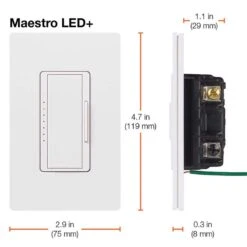 The Maestro LED+ dimmer switch provides optimal dimming performance of LED bulbs. This dimmer switch works with up to 150-Watt of dimmable LED/CFL or 600-Watt of incandescent/halogen, allowing you to control multiple bulb types on the same circuit. It is designed to control a broad range of dimmable LED and CFL bulbs from a variety of brands including Philips, Cree, GE, EcoSmart and Lighting Science. Use the rocker to adjust the light level for any activity or set the preset level to ensure lights always turn on to your desired light level. Advanced features include delayed fade to off, which allows time to exit a room or to get into bed before the lights turn off.Advanced programming settings for features such as customizable delayed-fade-to offTested on 1,000s of bulbs and dozens of brands for flicker-free dimmingProvides over 250 lighting levels so you can create the perfect light for any activityCoordinating Claro wall plate sold separatelyLutron patented technology to optimize the dim range of your bulb and prevent interference with other dimmers in the homeCan be used in single-pole or 3-Way/multi-location dimming applications (up to 10 locations, Maestro companion dimmer MA-RR-XX required)Easy-to-operate tap switch turns lights on/off to favorite light levelRocker dims and brightensInstalls in as little as 15 minutes in homes of all agesFor list of recommended bulbs view “Compatibility Chart”