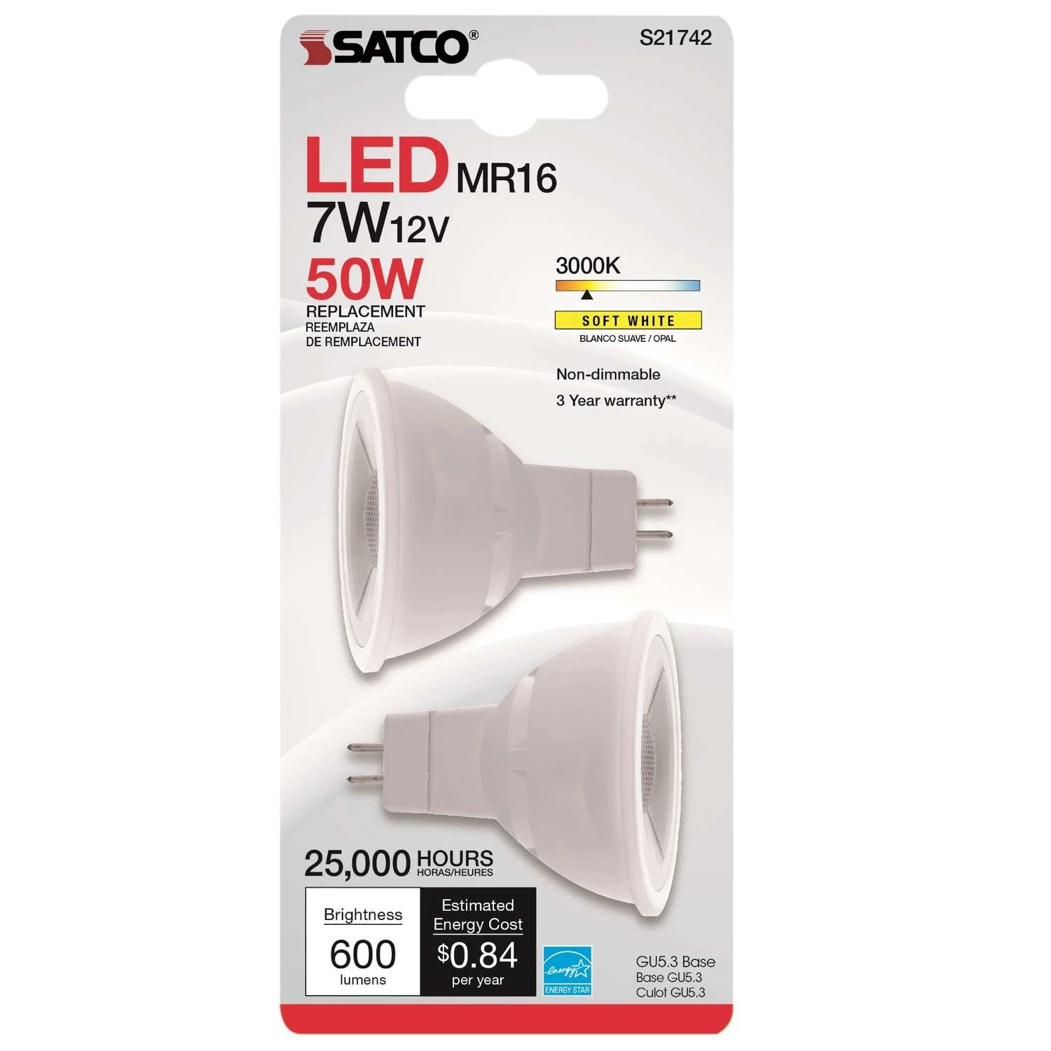 Satco MR16 GU5.3 LED Bulb Soft White 50 Watt Equivalence 2 Pk