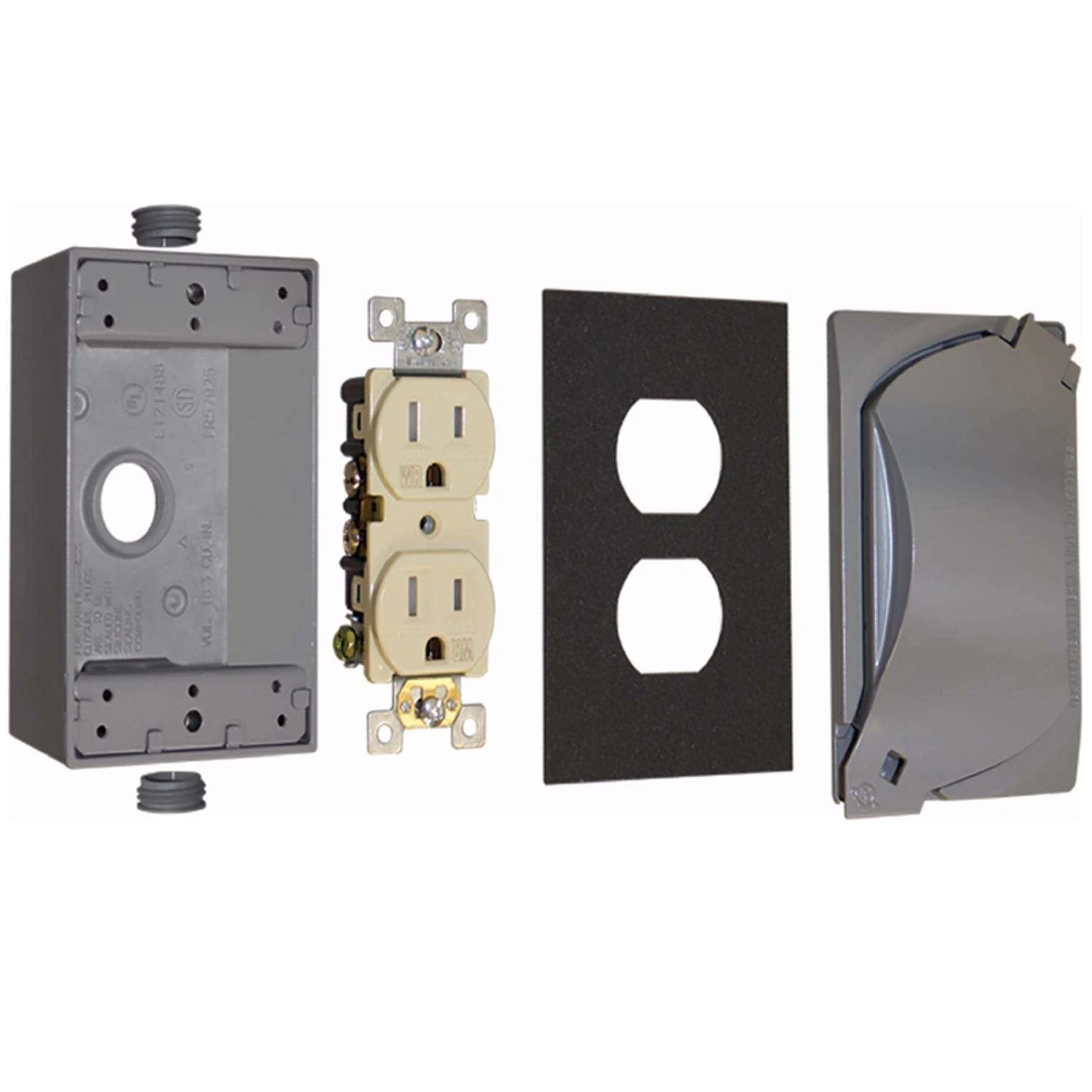 | What's Included | Universal cover, one-gang box, duplex receptacle, closure plugs, hardware and gasket |