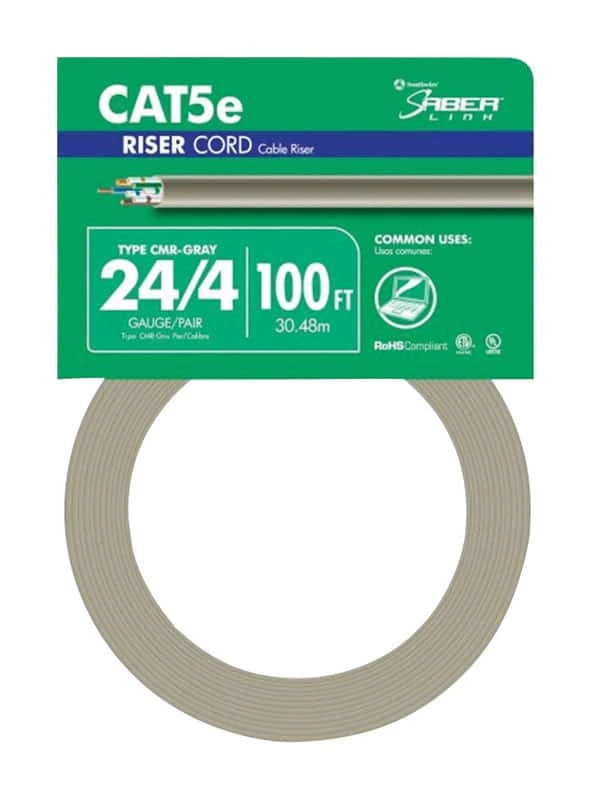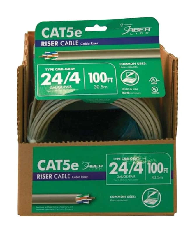 CAT 5E 24/4PR Riser Gray Cable 100 feet length. Accepts and is compatible with all standard RJ45 connectors. Suitable for Ethernet 1000 Base-T, PoE (Power over Ethernet), ATM 55/155 Mbps, ISDN, Digital Video, Multimedia, Voice and RS422 applications.Category 5E Riser CableSolid Annealed Copper Conductors300 VoltsMay Run In Plenums Or In Place Of Cm CablesThermoplastic Insulation24 gaugeGrey100′